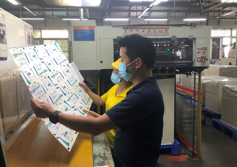技術研發(fā)部緊急制作和客戶確認產(chǎn)品文件和生產(chǎn)作業(yè)單,采購部協(xié)調(diào)紙張、膠膜、紙箱等物料快速到位,生產(chǎn)系統(tǒng)統(tǒng)籌協(xié)調(diào)規(guī)劃產(chǎn)線。24日晚,前期文件等準備工作和材料全部到位。25日早8點,客戶到公司車間機印刷現(xiàn)場確定顏色,9點半簽樣完成,2臺印刷機高速生產(chǎn)。