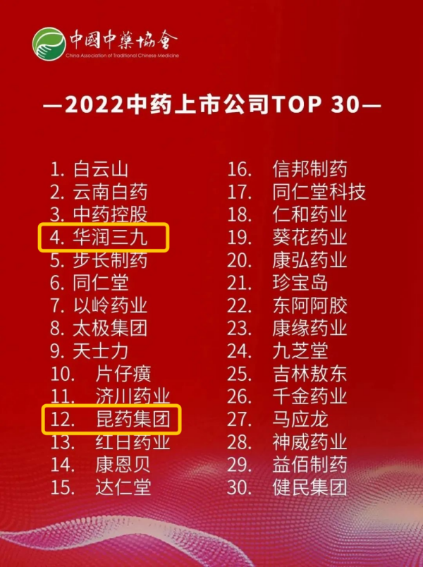 了解更多>>>華潤三九及旗下昆藥集團入選“2022中藥上市公司TOP30”榜單