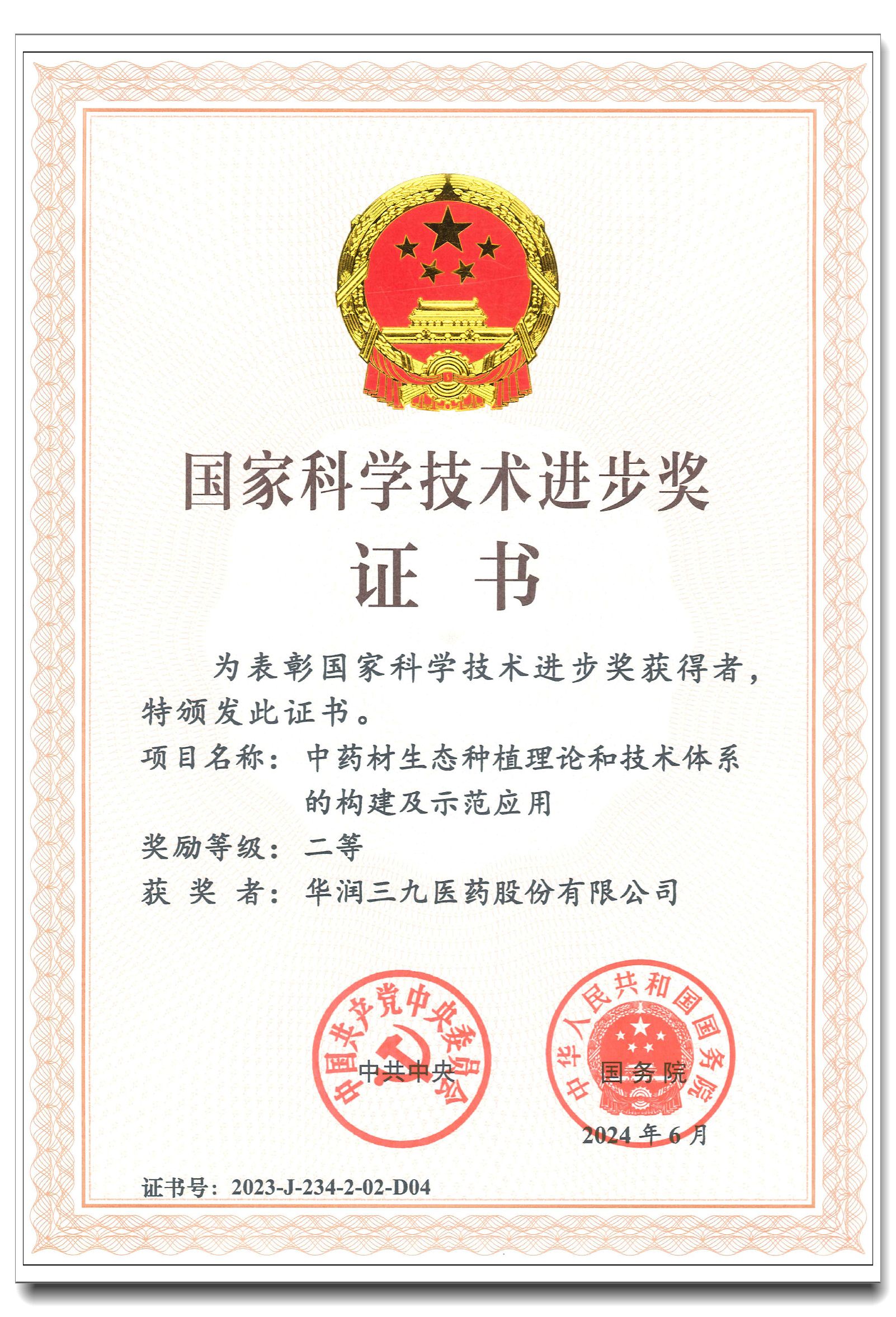 6月24日,2023年度國家科學技術獎勵大會在北京舉行。會上,華潤三九參與的《中藥材生態(tài)種植理論和技術體系的構建及示范應用》項目再次榮獲國家科學技術進步獎二等獎,這是對企業(yè)高度重視研發(fā)創(chuàng)新并取得豐碩成果的肯定。此前,以公司產(chǎn)品 “參附注射液”“紅花注射液”“參麥注射液”“新泰林”“999理洫王牌血塞通三七軟膠囊”“青蒿系列”為研究對象的科研項目,先后榮獲國家科學技術進步獎二等獎。