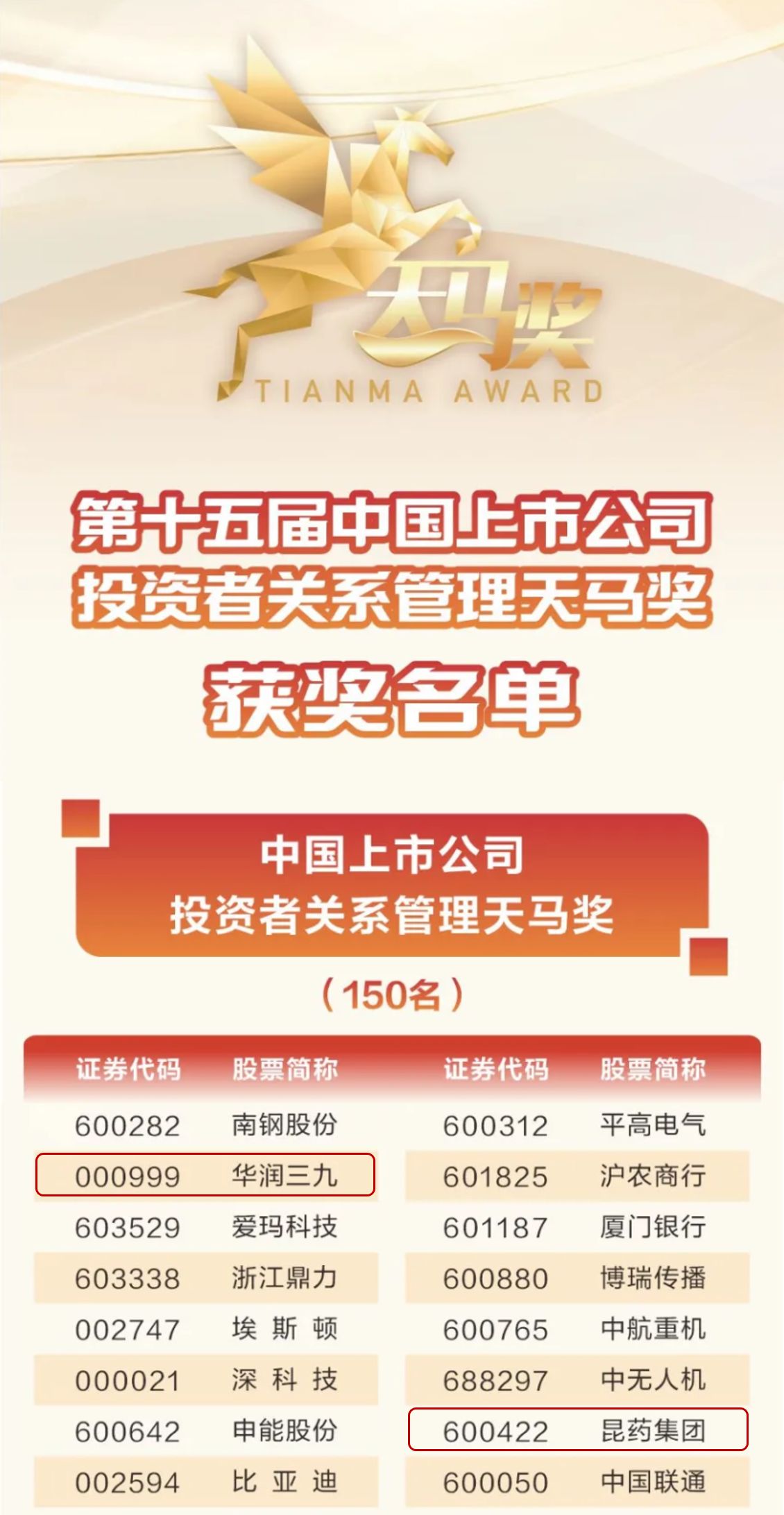 華潤(rùn)三九及旗下昆藥集團(tuán)榮獲“中國(guó)上市公司投資者關(guān)系管理天馬獎(jiǎng)”