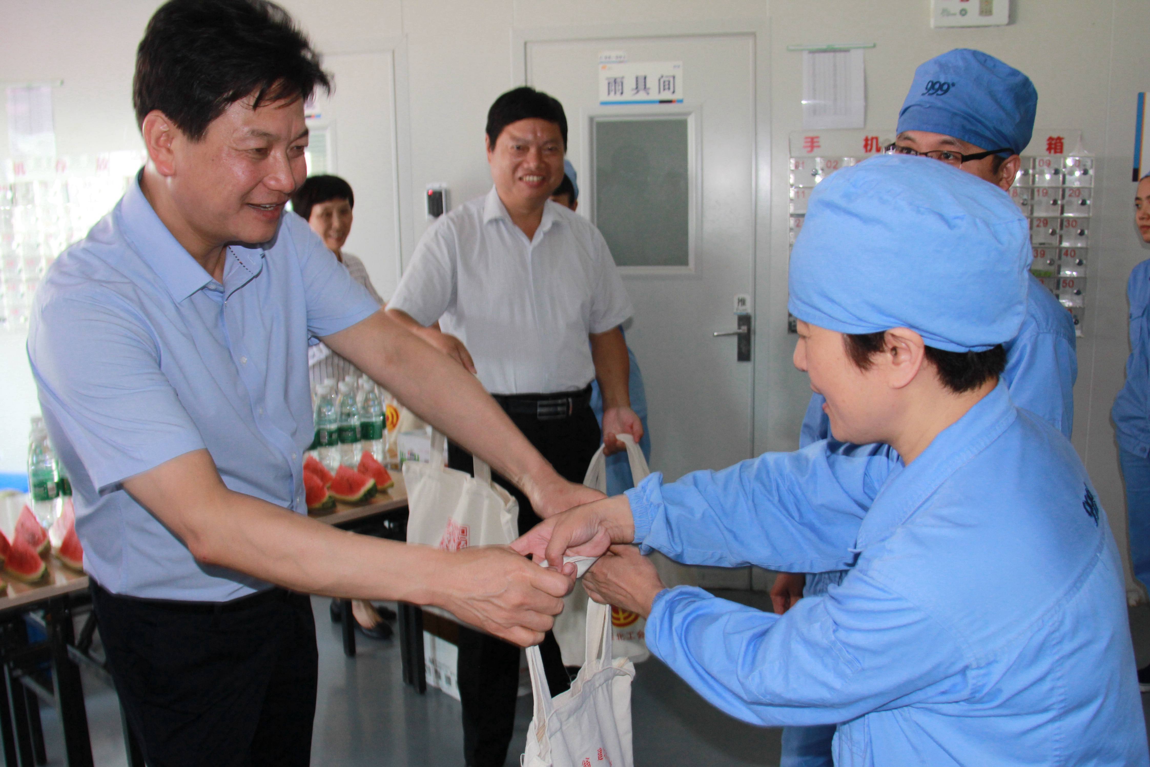 7月31日上午,淮北市委副書記李明,市人大常委會副主任、市總工會主席李曉光一行,來到安徽華潤金蟾藥業(yè)股份有限公司,開展“暑期送清涼”慰問活動,慰問在高溫下堅(jiān)守生產(chǎn)崗位的一線職工。