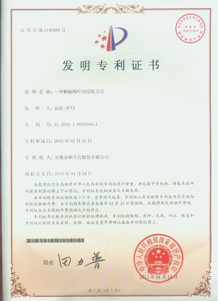 安徽華潤金蟾藥業(yè)股份有限公司申請的“一種蟾蜍噻嚀的提取方法”發(fā)明專利,近日獲得了國家知識產(chǎn)權(quán)局的專利證書,專利號:ZL201210039506.4。此項專利是華潤金蟾在產(chǎn)品深度研發(fā)和知識產(chǎn)權(quán)保護(hù)方面取得的又一項重大成果。