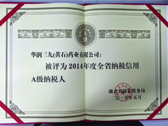 經(jīng)湖北省國家稅務(wù)局評定、審核,華潤三九(黃石)藥業(yè)有限公司被評定為2014年度A級納稅人。