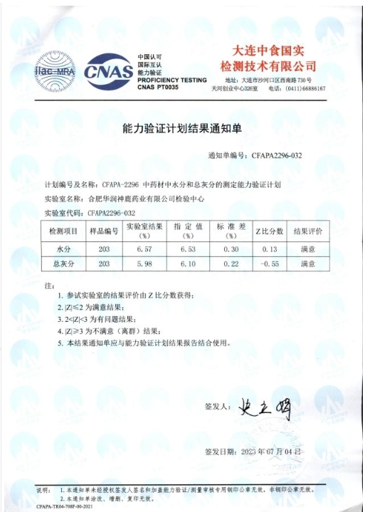 近日,在中國食品藥品檢定研究院公布的2023年的能力驗證計劃報告中,華潤神鹿檢驗中心參加的“藥品中霉菌和酵母菌總數(shù)計數(shù)能力驗證(NIFDC-PT-446)”及“藥品的比旋度測定能力驗證(NIFDC-PT-406)”分別榮獲滿意證書。大連中食國實檢測技術(shù)有限公司公布的2023年的能力驗證計劃報告中,華潤神鹿檢驗中心參加的“中藥材中水分和總灰分的測定能力驗證(CFAJPA-2296)”同樣榮獲滿意證書。上述四項滿意證書的獲得,標(biāo)志著2023年華潤神鹿檢驗中心參加上述能力驗證項目全部通過,并連續(xù)5年通過能力驗證。