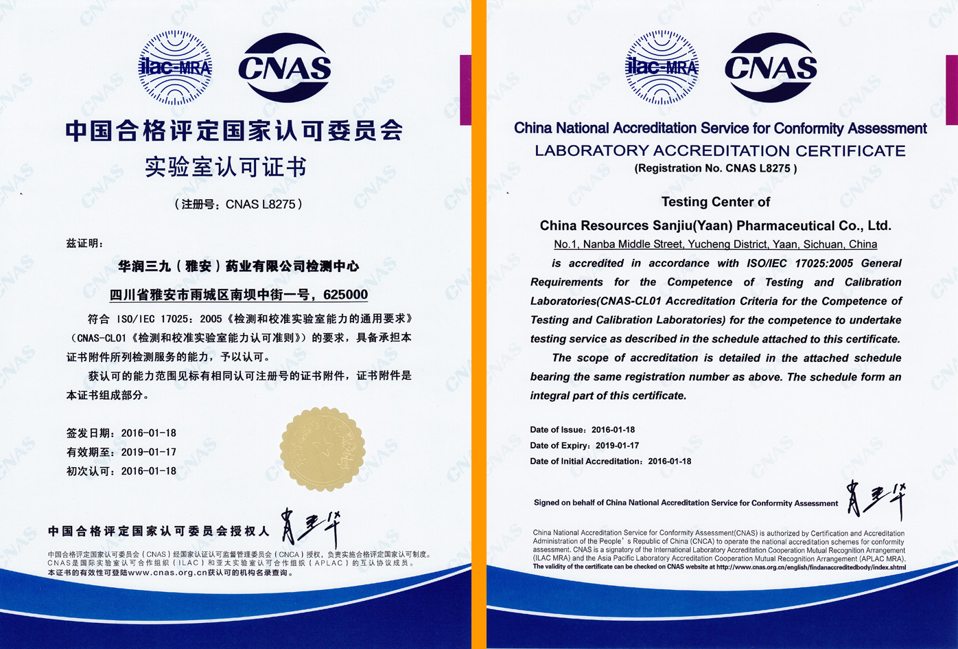 華潤三九(雅安)檢測中心取得CNAS認(rèn)可證書